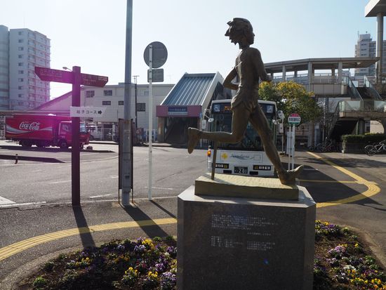 京成佐倉駅。マラソンランナーの像があります。