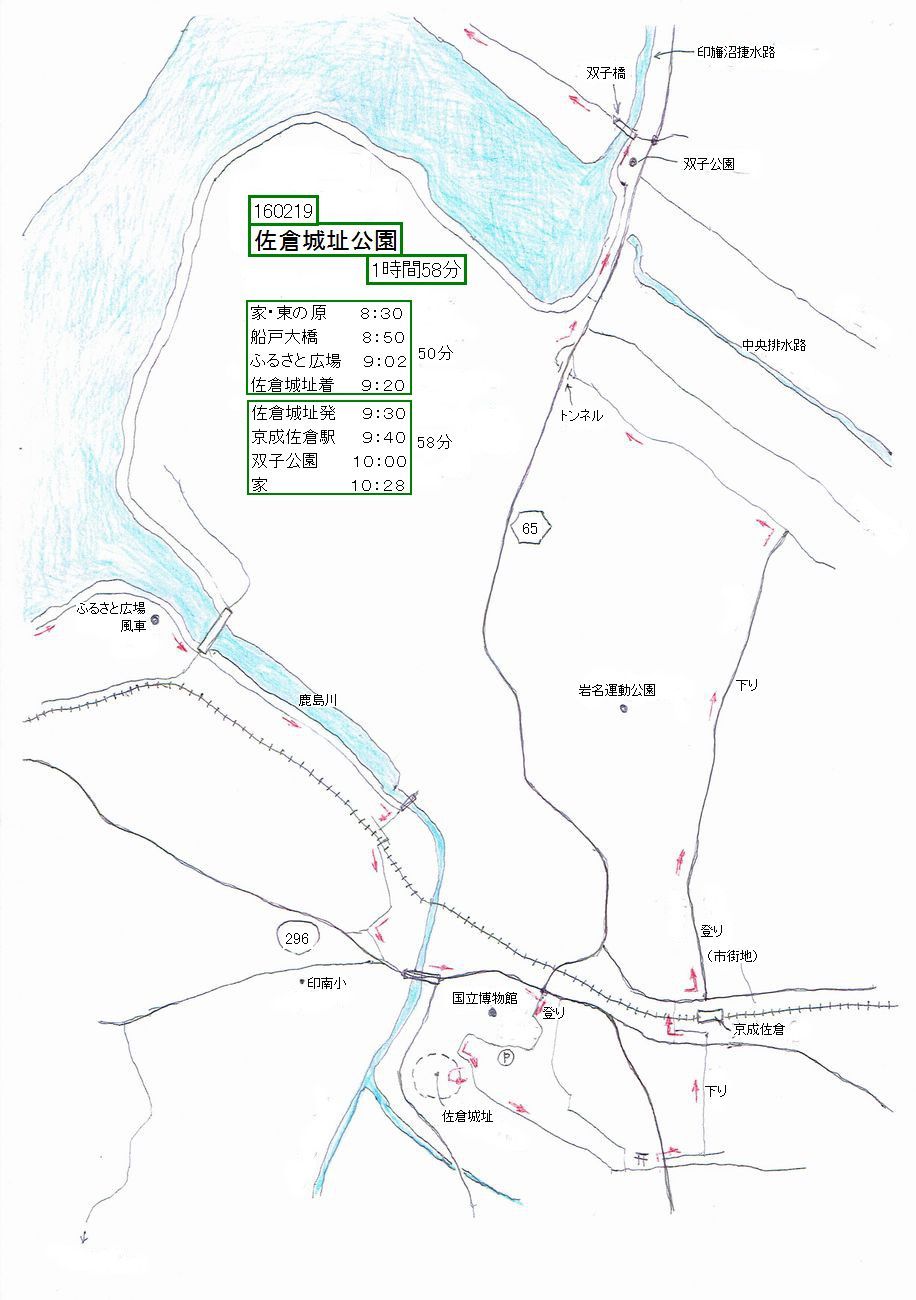 ここでは船戸大橋から印旛沼、鹿島川を経てで城址公園に至り、帰りは、京成佐倉駅から山越えして