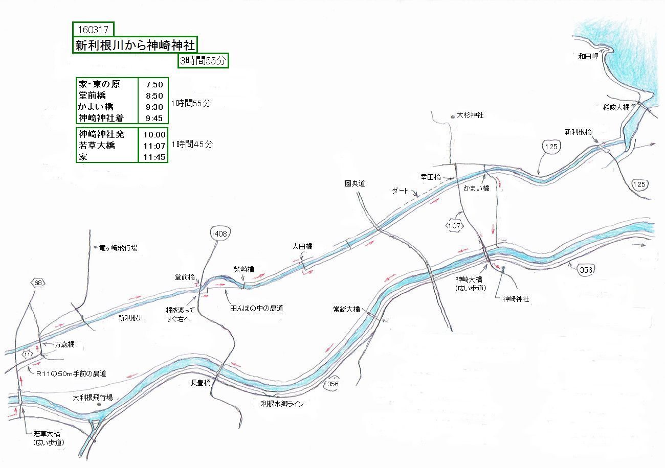 新利根川から利根川サイクリングロードへ周回するルート。新利根川をかまい(釜井)橋まで行って、農道を神崎橋まで南下する。