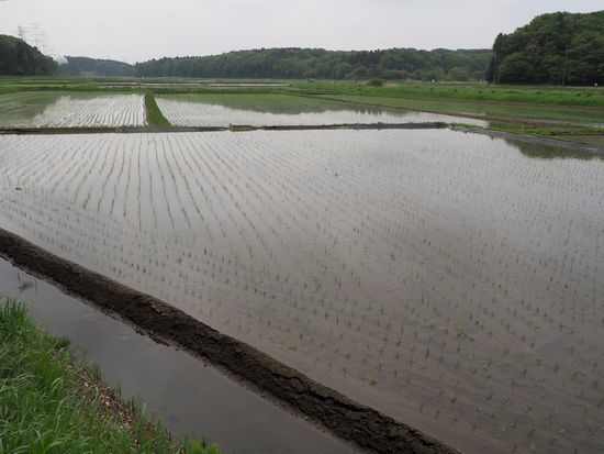 いつもの手繰川の谷津風景。田植えは終わったようです。