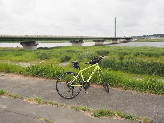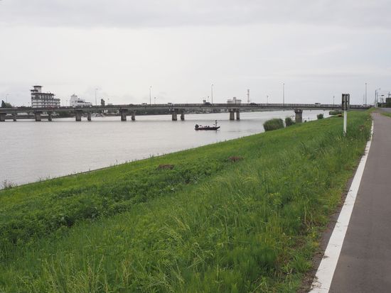 潮来から利根川サイクリングロードに出ました。向こうの橋は、水郷大橋、R51です。