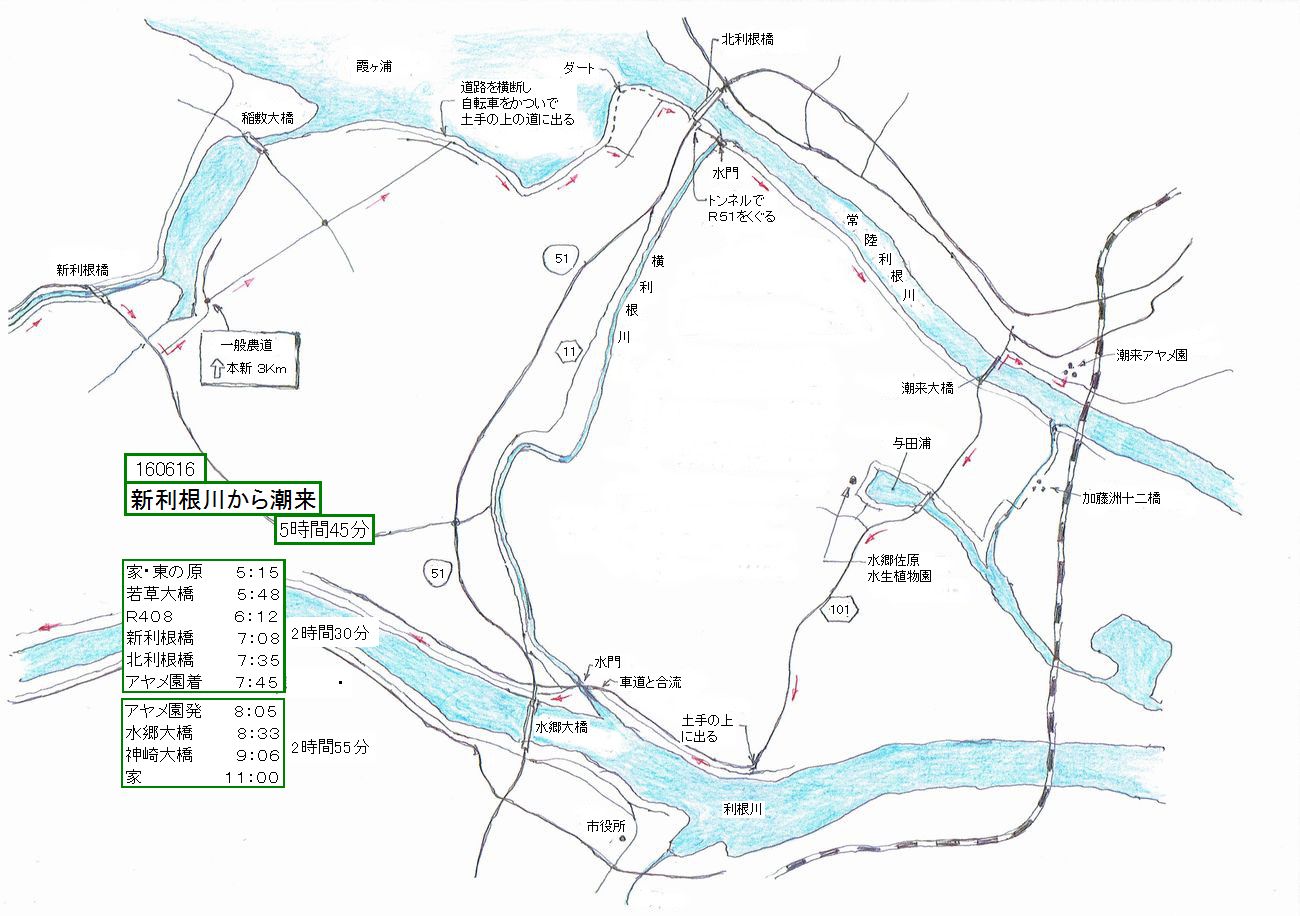 潮来アヤメ園に至る。帰りは利根川CR.なお、新利根橋までは、151231 を参照下さい。