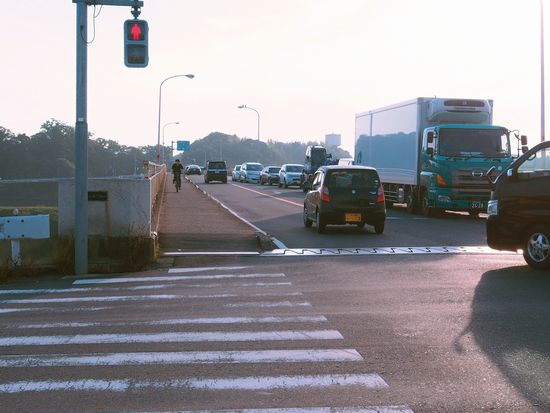 朝の栄橋。車で込み合っています。