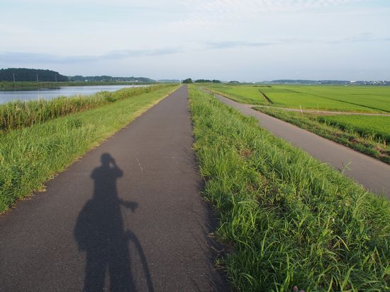 手賀川沿いのサイクリングロード。朝日で私の影が写っています。