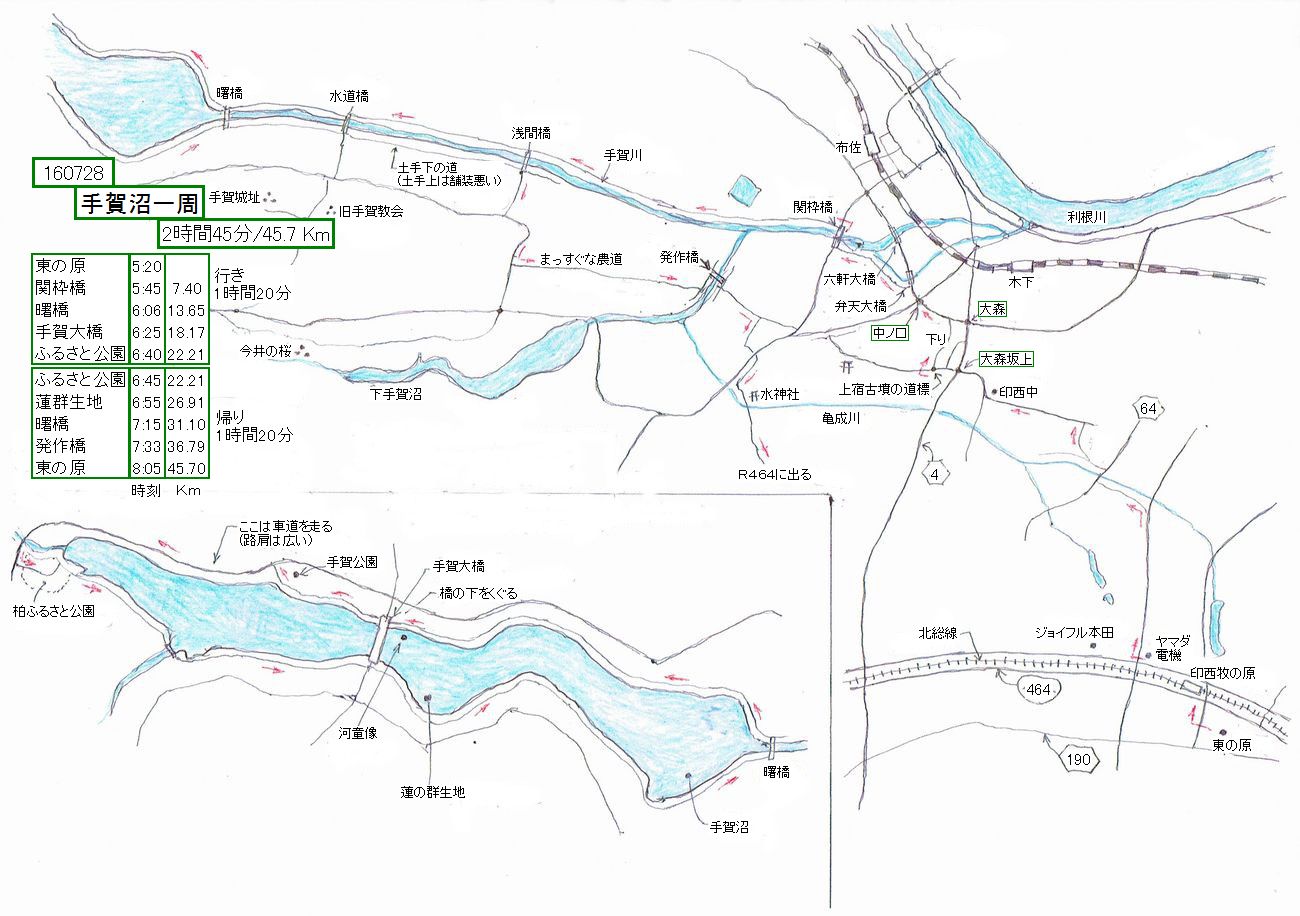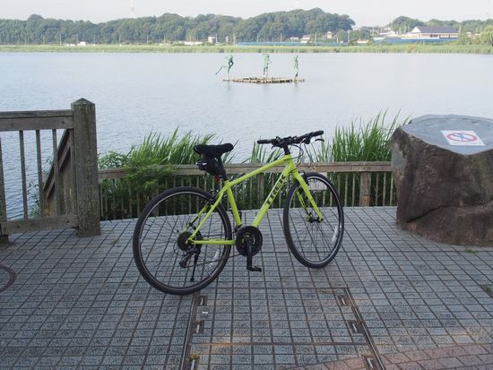 関枠橋から手賀川沿いに手賀沼に至り、反時計回りで手賀沼を一周します。北岸はサイクリングロードと言うよりは遊歩道で、狭いし