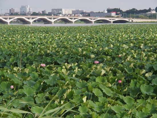 手賀沼南岸、蓮の群生地からの手賀大橋。