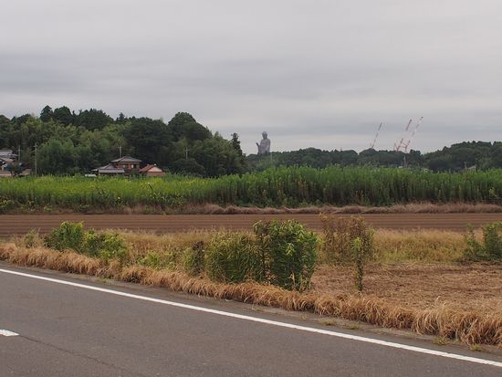 R408を過ぎ、乙戸川沿いの道に入る。前方に牛久大仏が現れる。