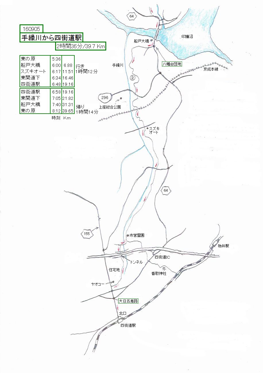 手繰川谷津道は何度も通ったが、いずれも東関道から先は物井駅方面に抜けていた。今回は手繰川を源頭