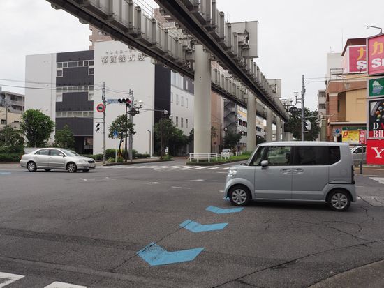 「都賀駅東口入口」の交差点です。このモノレールの下を進みます。