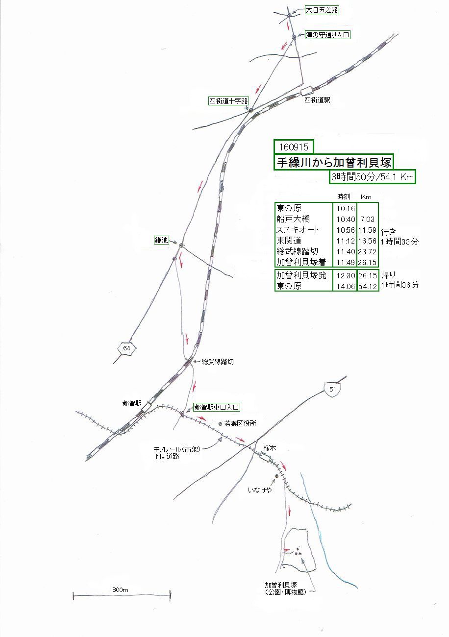 手繰川谷津道から四街道に出て、R64を進み、都賀駅近くのモノレールの下を行き、加曾利貝塚に至るルートです。