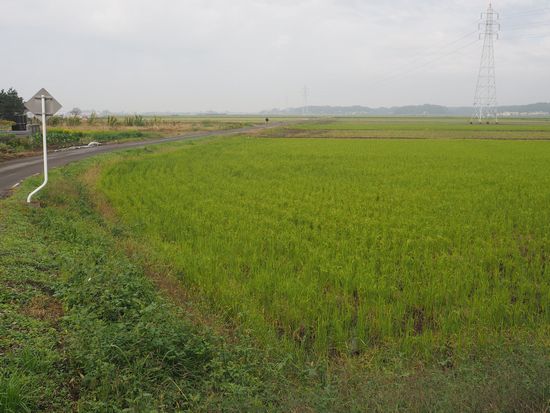 田圃の中の真直ぐな農道を行く。遠くに見える山の上に撮影所があります。
