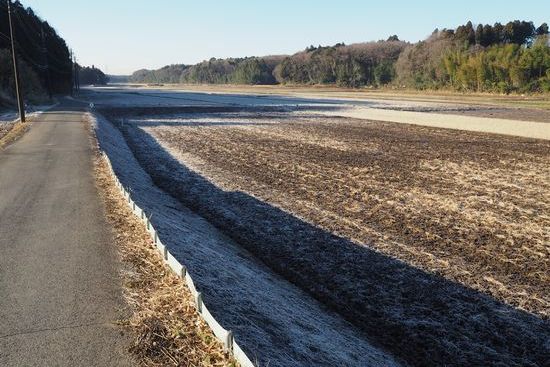 凍てつく手繰川谷津道。日陰は霜で真っ白です。