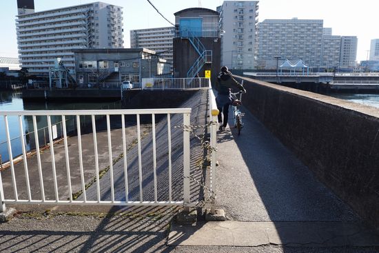 橋を渡って、更に水門の上の通路を通ります。狭いので自転車を押して歩きます。