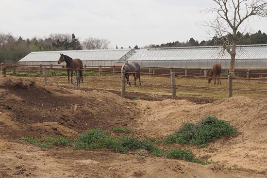 若草牧場の隣の乗馬クラブ。ここと若草牧場の間の道を右折し、谷に下ります。