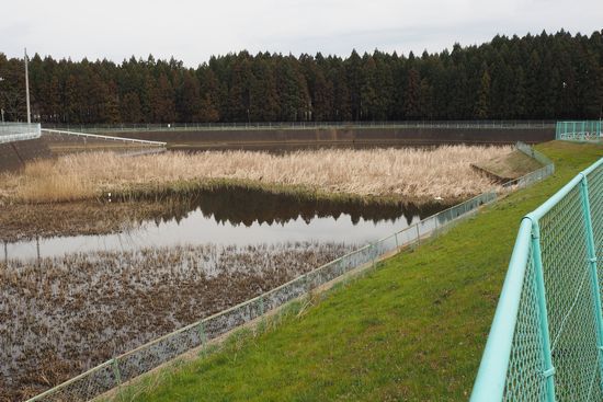 木戸川沿いに登ってきて、これが成田市本城の調整池。木戸川の水源です。周りは住宅地と