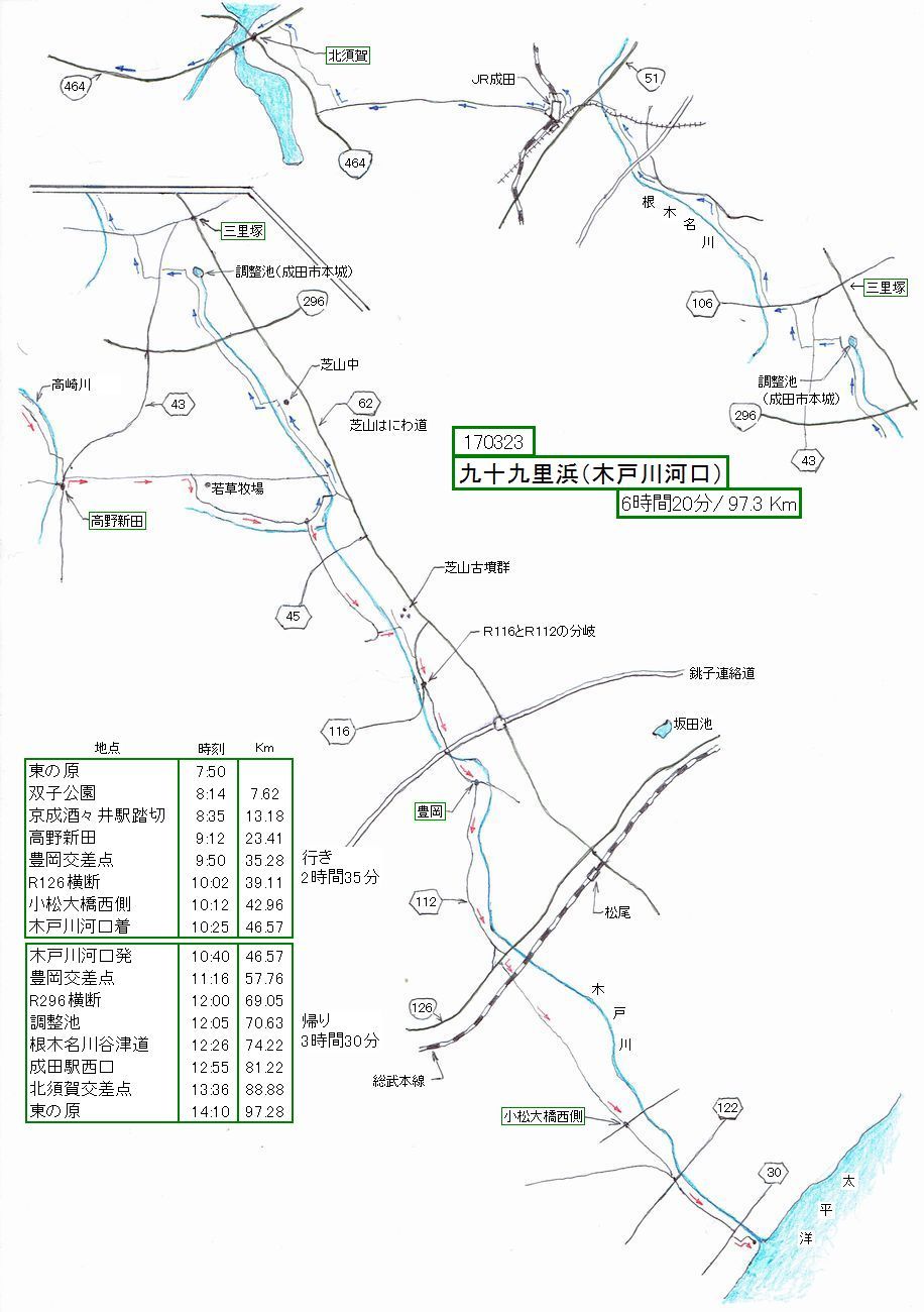 調整池からは根木名川を下り、成田駅西口に出て、開通したばかりの北千葉道路(464バイパス)を経て牧の原に戻りました。