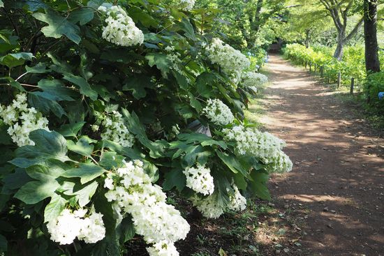 特色は、普通の在来紫陽花もありますが、白色、円錐状の柏葉紫陽花が多くあることです。よって、よその紫陽