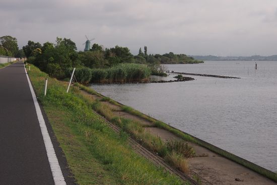 125号をちょっと走り、花室川沿いから霞ヶ浦沿いの眺めの良い道を行きます。前方、風車