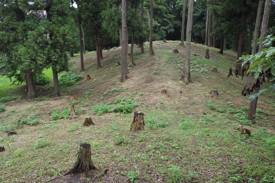 後円部から前方部を見る。現在は木々が茂っているので手賀沼は見えませんが、位置からして、古墳