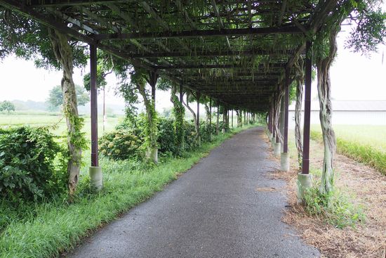 再び坂を下りて道路を横断すると、この長い藤棚。通り抜けると湖岸の遊歩道です。