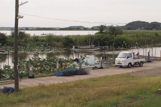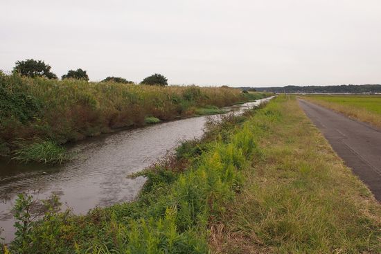 北須賀交差点から側道を進み、「下総松崎駅」の道標に従い、沼沿いの水路に出ます。画面左の