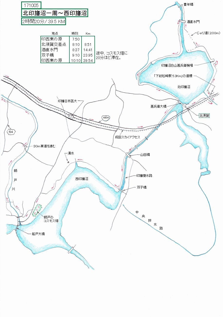 西印旛沼は容易に一周することが出来ます。一方、北印旛沼の方は、北千葉道路(464バイパス)の延伸でアプローチが容易