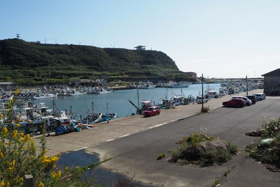 ここは港の最奥部。岬の崖の上に飯岡刑部岬展望館が見えます。あそこがゴールです。