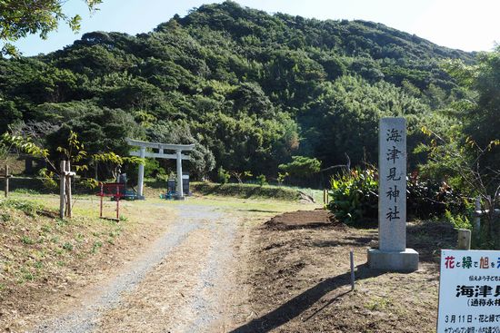 港から岬の上まで自走すると遠回りなので、ここ海津見神社脇にある遊歩道で、自転車を押したり