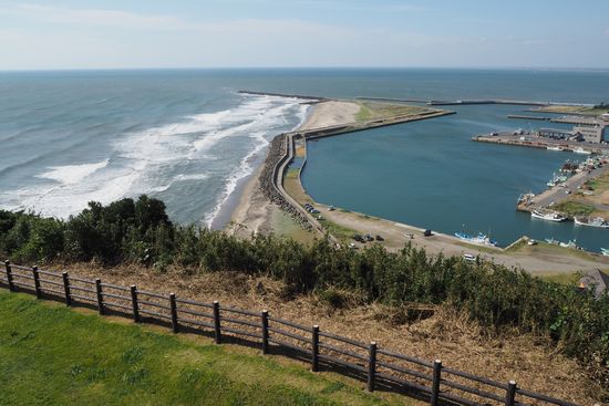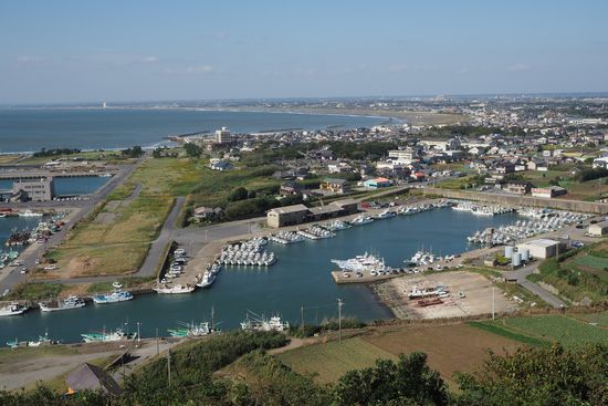 展望館からの素晴らしい眺め。飯岡漁港とその先に九十九里浜。この日は北東風がやや強く、視界良好です。