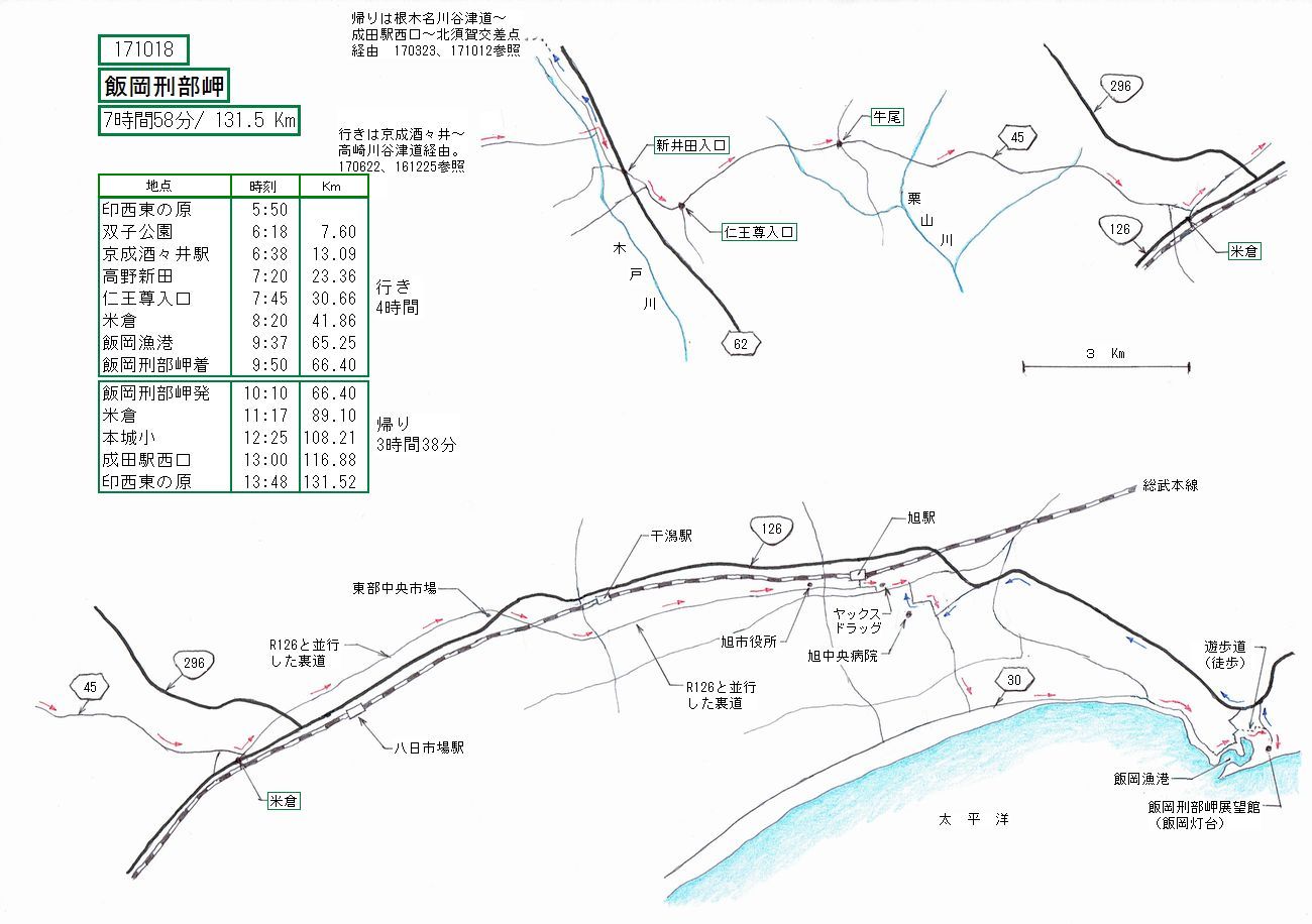 往路は、酒々井から高崎川谷津道経由で芝山へ。そこからR45で海辺に向かいます。後はR126沿いに進んで、飯岡漁港/飯岡
