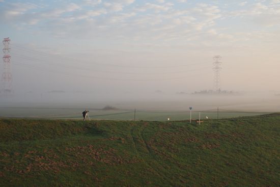 若草大橋から茨城側を撮ったもの。土手で三脚を据えているカメラマンは、霧の利根川と、昇ってくる朝日を