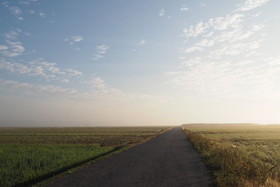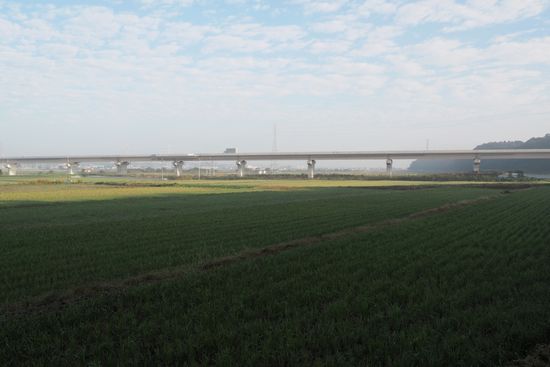 非常に広大な農地が広がります。遠景が霧で隠れているので、遠い地平線が見えているみたいです。