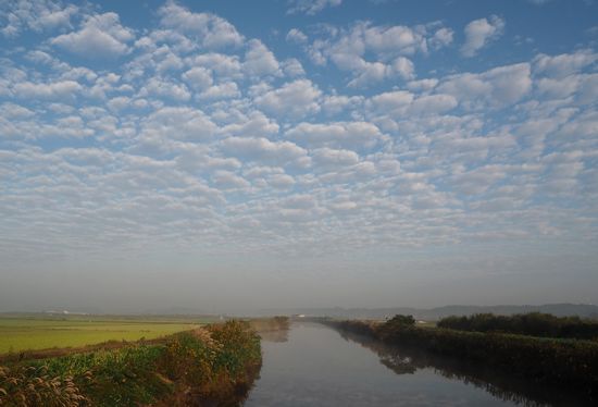茨城研究農場脇の道は、やがて破竹川を渡ります。霧も晴れて、秋の空には鱗雲が・・。