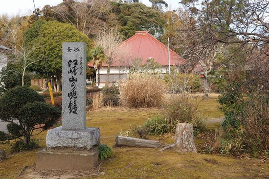 管天寺境内の「江崎山の晩鐘」の碑。 この寺は、中世、200年にわたり県南に威をふるった土岐原氏の