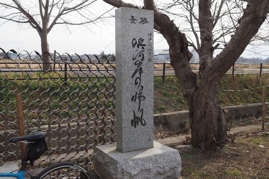 「浜河岸の帰帆」の碑。川沿いにあるのですが、フェンスがあって、川からは行けません。大正橋から