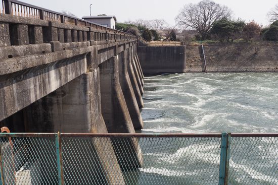 関宿水閘門。利根川の水が、轟々と江戸川に流れ込んでいます。
