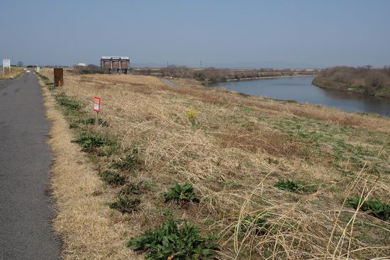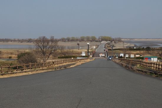 渡良瀬川沿いのサイクリングロードを進んでいます。遠景の赤い橋が三国橋で、あれを渡ると谷中湖