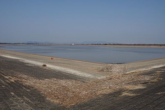 三国橋を渡り、土手のCRを進んでくると、前方に水門が見えてきます。あの先が谷中湖です。