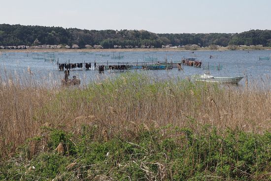 帰途、双子公園からの印旛沼の景色。対岸に桜の木の連なっているのが見えます。