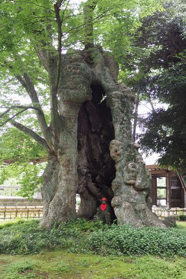 推定樹齢1600年。県内で最も太いケヤキですが、過去の火災で内部が空洞となり、そこに地蔵が置かれ、
