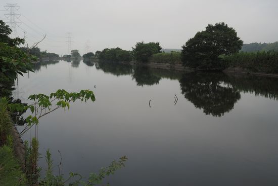 利根親水公園の貯水池。前回は快晴でしたが、今回は朝靄が出て、墨絵風の景色。