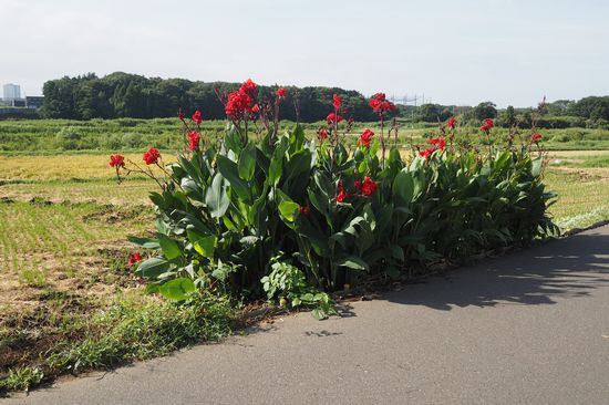 やちよ道の駅から桑納川(かんのうがわ)谷津道を進みます。カンナの花が咲いていました。稲の刈り入れは