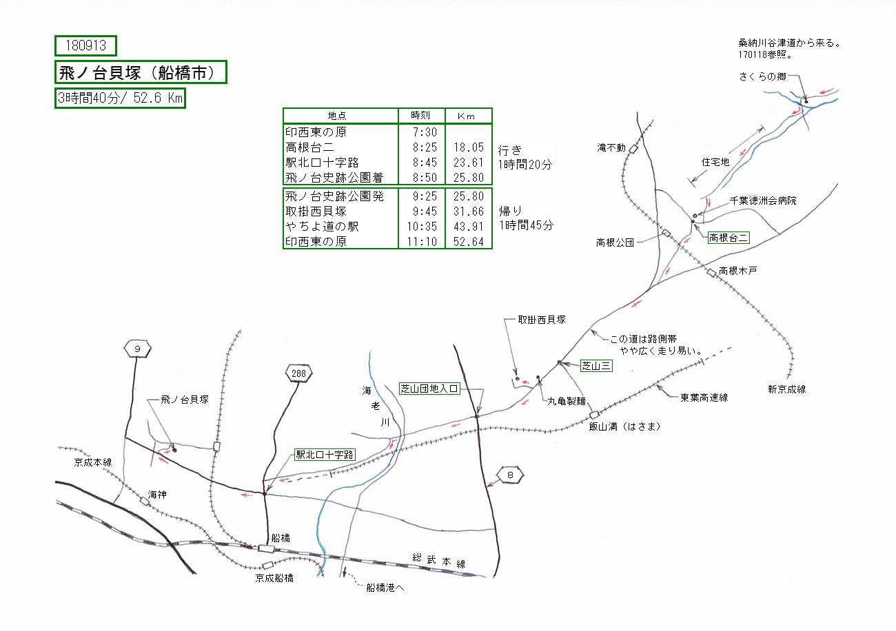 船橋市まで史跡(貝塚)を見学に行ってきました。ルートはいつもの桑納川谷津道経由。途中、左折すべきとこ