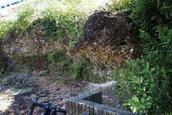 帰り道で、道端に貝層の露頭が見られます。12〜13万年前にここは古東京湾の海底でありました。その時、積み重なった