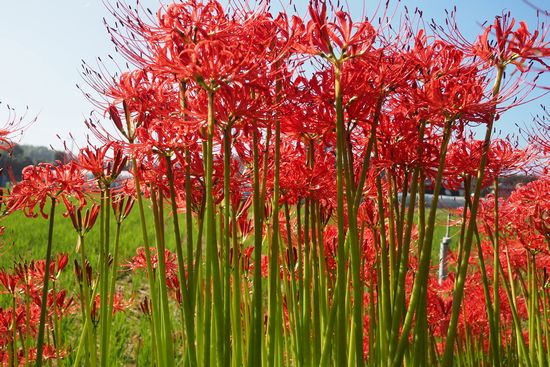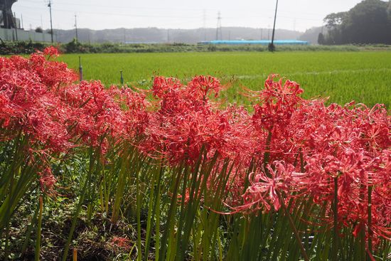 田んぼの向こうに彼岸花の群生が見えてきました。あそこが持法院です。
