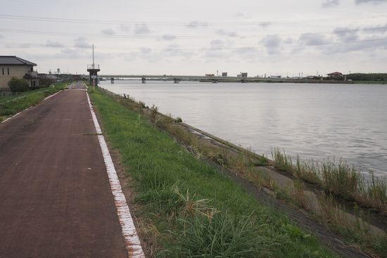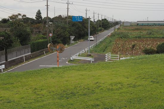 やがて土手下に写真の道路が見えてきます。自転車を抱えて土手を降りて、この道で国道125号と新利根川に向かい
