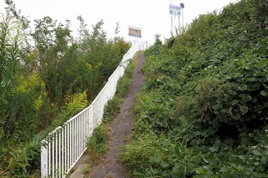 路面のペイントに従って進むと、道は橋の下をトンネルで抜けます。すると、巾1m程の急坂が現れ、ここを自転車
