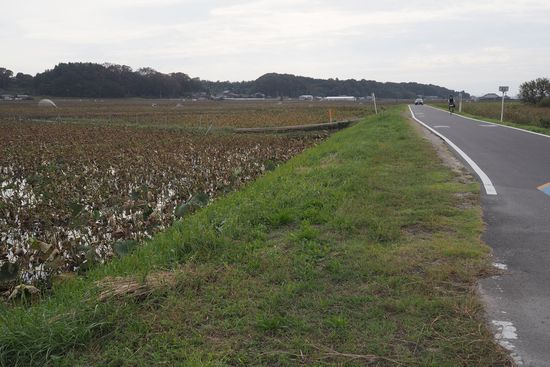 土浦から暫くは、左側に蓮田が続きます。サイクリングロードは車道兼用で、車が来ます。