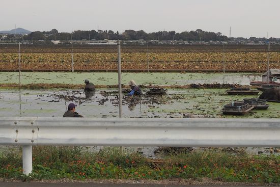 蓮田は丁度、蓮根の取り入れの時期らしく、あちこちで田に入っている人を見かけました。