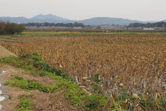 振り返ると、蓮田の向こうに筑波山が見えています。